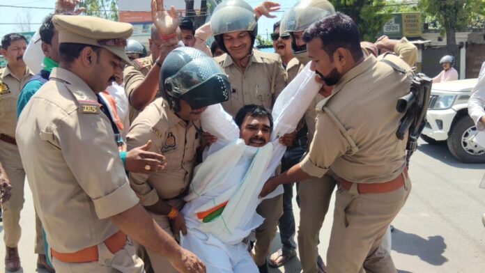 जिला उपाध्यक्ष गुलाम रसूल “छोटू” को जिला कांग्रेस कार्यालय के बाहर रोक लिया गया। कांग्रेस जिला अध्यक्ष कृष्ण कुमार यादव अपनी गाड़ी मे पुतला लेकर आ रहे थे पुलिस को इसकी भनक लग गई और पुलिस ने तहसील तिराहे से उनकी गाड़ी का पीछा करके पटेल नगर तिराहे पर उन्हे वही रोक लिया गया। पुतले के लिए कांग्रेस जिला अध्यक्ष और पुलिस से छीना झपटी हुई, उस दौरान वहाँ पर रेहान जैदी, कुलदीप उपाध्याय, दीपक मिश्र, राजेश प्रजापति, विश्वभान मिश्र “मस्सू”, राजीव गुप्ता, रामनरेश पाल, असगर अली, दीपक वर्मा, नंदकुमार गुप्ता “दद्दू”, जितेन्द्र राव, अमित कुमार यादव “संजय”, हाजी सलीम, रविकांत गौड, मो. परवेज पहुंच गये और वही सडक पर बैठकर विरोध प्रदर्शन करने लगे।